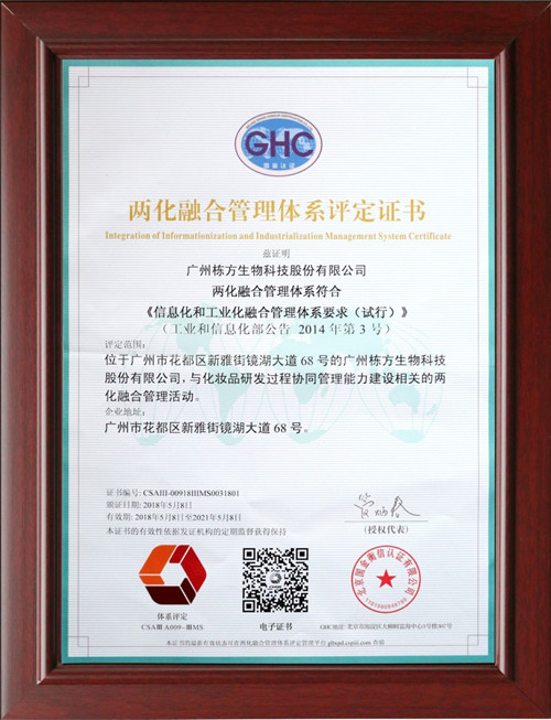 5月8日,棟方股份兩化融合管理體系順利通過專家組審核,獲得頒發(fā)兩化融合管理體系評定證書,成為率先通過該體系評估審核的化妝品研發(fā)制造企業(yè)。棟方股份成功實現(xiàn)兩化融合,企業(yè)競爭力將會得到進一步的提升,在管理水平和工作效率方面得到明顯改善,必會更好服務于客戶和市場。