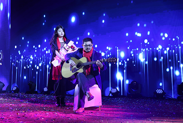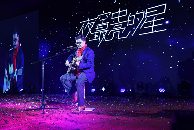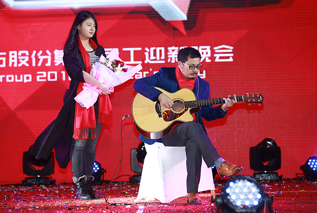 受現(xiàn)場氣氛感染,唐董也攜吉他登臺,即興彈唱了《夜空中最亮的星》、《當(dāng)你老了》,鼓舞棟方股份集團的奮斗者們,在新的一年勇敢前行。