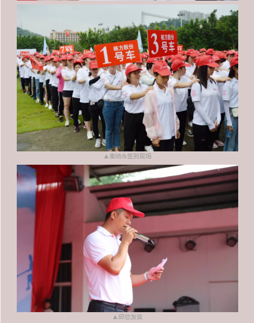 抵達目的地后,看到的是佇立在綠油油草地上的簽到墻,還有等候多時的基地教導員;在教導員的帶領下整齊列隊簽到,進入訓練場地,邱總上臺發(fā)言。