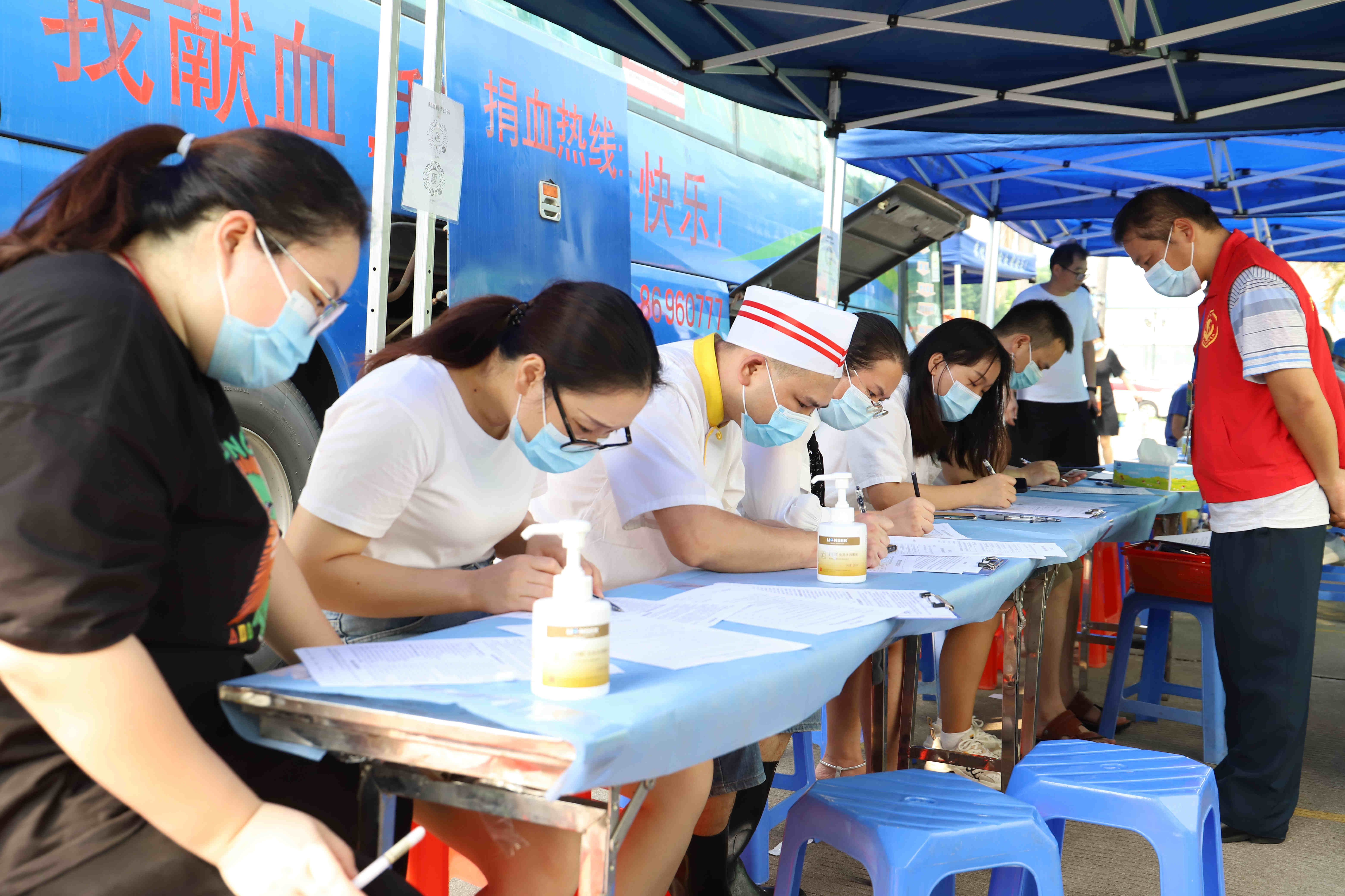早上九點,獻血員工在采血點集合,在工作人員的指引下,有條不紊地進行身體檢查。通過篩選后,符合獻血標準的人員依次有序地踏上獻血車,紛紛起挽起衣袖獻出自己的一份愛心,